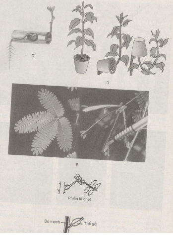 Các hình dưới đây mô tả các hình thức cảm ứng của thực vật. Quan sát các hình và cho biết đó là hình thức cảm ứng nào ? Giải thích. Lời giải: a) Quang ứng động của cây bồ công anh (hình A, B). Vì : ứng động nở hoa là phản ứng sinh trưởng quang ứng động. Hoa của cây bồ công (Taraxacum officinale) mở ra lúc sáng và đóng lại lúc chạng vạng tối hoặc lúc ánh sáng yếu. b) Tính hướng đất ở cây (C, D) : Rễ quay xuống đất, thân quay lên trờiỂ Vì : Vận động hướng đất theo chiều lực hút của trọng lực Trái Đất là do sự phân bố điện tích và auxin không đều ở hai mặt rễ. Mặt trên có lượng auxin thích hợp cần cho sự phân chia lớn lên và kéo dài của tế bào làm rễ cong xuống đất. Rễ có hướng đất dương. Ở chồi ngọn thì ngược lại : hướng đất âm. c) Vận động cảm ứng của lá cây trinh nữ (cây xấu hổ : E, F). Vì : Lá cây trinh nữ thường xoè lá chét thành một mặt phẳng. Khi vật chạm vào lá, các lá chét khép lại, cuống cụp xuống. Lá khép cụp xuống do thể gối ở cuống lá và gốc lá chét giảm sút sức trương với sự chuyển vận ion K+ đi ra khỏi không bào gây sự mất nước, giảm áp suất thẩm thấu. Phản ứng bắt đầu ngắn hơn 0,1 giây và hoàn thành trong khoảng 1 giây ; sự phục hồi cần 10 đến 20 phút. Cơ chế biến đổi độ trương trong tế bào thể gối có thể so sánh với sự biến đổi độ trương trong tế bào khí khổng (do sự biến đổi nồng độ K+, thế thẩm thấu). d) Cây ăn sâu bọ : G. Cây nắp ấm ; H. Cây bắt ruồi. Vì : Khi con mồi chạm vào lá, sức trương giảm sút, làm các gai, tua, lông cụp, các nắp đậy lại giữ chặt con mồi. Các tuyến trên các lông của lá tiết enzim phân giải prôtêin của con mồi. Sau một thời gian khoảng vài giờ, sức trương được phục hồi, các gai, lông, nắp lại trở lại vị trí bình thường. e) Vận động quấn vòng của tua cuốn (L, M, N). Vì : Vận động quấn vòng do sự di chuyển đỉnh, chóp của thân leo, các tua cuốn. Các tua cuốn tạo các vòng giống nhau di chuyển liên tục xoay quanh trục của nó. Thời gian quấn vòng tuỳ theo loại cây. Ví dụ : rau muống có sự quấn vòng diễn ra cứ 5 phút một lần. Trong 3 giờ, đỉnh chồi của rau muống chuyển 35 vị trí theo vòng xoắn.