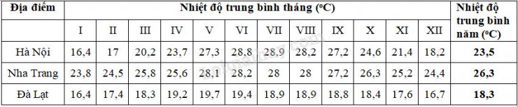 Đề bài Dựa vào bảng số liệu dưới đây, em hãy tính nhiệt độ trung bình năm của Hà Nội, Nha Trang, Đà Lạt: - Nhận xét và giải thích sự thay đổi của nhiệt độ trung bình năm giữa Hà Nội và Nha Trang (theo vĩ độ). - Nhận xét và giải thích sự khác biệt nhiệt độ trung bình năm giữa Nha Trang và Đà Lạt (so sánh sự thay đổi nhiệt độ do chênh lệch về độ cao). Lời giải chi tiết - Tính nhiêt độ trung bình năm của Hà Nội, Nha Trang, Đà Lạt: - Nhận xét và giải thích sự thay đổi của nhiệt độ trung bình năm giữa Hà Nội và Nha Trang (theo vĩ độ). + Nhiệt độ trung bình năm ở Hà Nội (23,5oC), thấp hơn 2,8oC so với nhiệt độ trung bình năm ở Nha Trang (26,3oC) vì Hà Nội nằm ở vĩ độ cao hơn so với Nha Trang nên lượng ánh sáng và nhiệt nhận được từ Mặt Trời ít hơn, nhiệt độ không khí thấp hơn. - Nhận xét và giải thích sự khác biệt nhiệt độ trung bình năm giữa Nha Trang và Đà Lạt (so sánh sự thay đổi nhiệt độ do chênh lệch về độ cao) + Nhiệt độ trung bình năm ở Đà Lạt là 18,3oC thấp hơn đến 8oC so với nhiệt độ trung bình năm ở Nha Trang (26,3oC). + Có sự khác biệt này là do vì Đà Lạt nằm ở độ cao 1513m, lớn hơn nhiều so với Nha Trang nằm ở độ cao 6m so với mực nước biển; càng lên cao nhiệt độ càng giảm, trung bình giảm 0,6oC/100m.