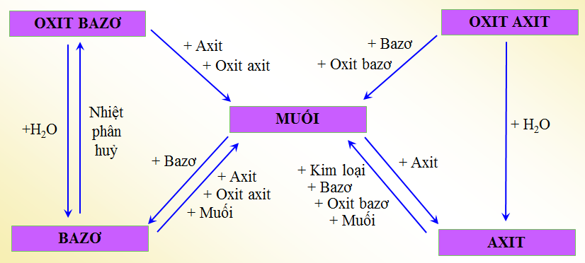 Tóm tắt lý thuyết 1. Mối quan hệ giữa các loại chất vô cơ Hình 1: Mối quan hệ giữa các loại chất vô cơ2. Những phản ứng hoá học minh họa 1. CaO +2 HCl → CuCl2 +H2O 2. CO2 + 2NaOH → Na2CO3 + H2O 3. K2O + H2O → 2KOH 4. Cu(OH)2 → CuO + H2O 5. SO3 + H2O → H2SO4 6. Mg(OH)2 + H2SO4 → MgSO4 + 2H2O 7. CuSO4 + 2NaOH → Cu(OH)2 + Na2SO4 8. AgNO3 + HCl → AgCl + HNO3 9. H2SO4 + ZnO → ZnSO4 + H2O * Lưu ý: Một số oxit kim loại như Al2O3, MgO, BaO, CaO, Na2O, K2O … không bị H2, CO khử. Các oxit kim loại khi ở trạng thái hoá trị cao là oxit axit như: CrO3, Mn2O7,… Các phản ứng hoá học xảy ra phải tuân theo các điều kiện của từng phản ứng. Khi oxit axit tác dụng với dd Kiềm thì tuỳ theo tỉ lệ số mol sẽ tạo ra muối axit hay muối trung hoà. NaOH + CO2 →NaHCO3 2NaOH + CO2 → Na2CO3 + H2O Khi tác dụng với H2SO4 đặc, kim loại sẽ thể hiện hoá trị cao nhất, không giải phóng Hidro Cu + 2H2SO4 → CuSO4 + SO2 + H2SO4 3. Tổng kết Hình 2: Sơ đồ tư duy về Mối quan hệ giữa các hợp chất vô cơBài tập minh họa Bài 1: Hoàn thành chuỗi phương trình phản ứng sau: Fe → FeCl2 → Fe(NO3)2 → Fe(OH)2 → FeO Hướng dẫn: \(\begin{array}{l} \left( {\rm{1}} \right){\rm{ Fe + 2HCl}} \to {\rm{FeC}}{{\rm{l}}_{\rm{2}}}{\rm{ + }}{{\rm{H}}_{\rm{2}}}\\ \left( {\rm{2}} \right){\rm{ FeC}}{{\rm{l}}_{\rm{2}}}{\rm{ + 2AgN}}{{\rm{O}}_{\rm{3}}} \to {\rm{Fe}}{\left( {{\rm{N}}{{\rm{O}}_{\rm{3}}}} \right)_{\rm{2}}}{\rm{ + 2AgCl}}\\ \left( {\rm{3}} \right){\rm{ Fe}}{\left( {{\rm{N}}{{\rm{O}}_{\rm{3}}}} \right)_{\rm{2}}}{\rm{ + 2NaOH}} \to {\rm{Fe}}{\left( {{\rm{OH}}} \right)_{\rm{2}}}{\rm{ + 2NaN}}{{\rm{O}}_{\rm{3}}}\\ \left( {\rm{4}} \right){\rm{ Fe}}{\left( {{\rm{OH}}} \right)_{\rm{2}}}({t^0}) \to {\rm{FeO + }}{{\rm{H}}_{\rm{2}}}{\rm{O}} \end{array}\) Bài 2: Ngâm một lá đồng vào dung dịch AgNO3 20%. Sau phản ứng, thu được dung dịch đồng (II) sunfat (CuSO4) và 10,8 gam Ag. Biết AgNO3 phản ứng hết. a) Viết phương trình phản ứng b) Tính khối lượng dung dịch AgNO3 20% đã tham gia phản ứng. Hướng dẫn: Số mol của Ag là: \({n_{Ag}} = \frac{m}{M} = \frac{{10,8}}{{108}} = 0,1(mol)\) a) Phương trình phản ứng: AgNO3 + Cu→ CuSO4 + Ag 0,1 \(\leftarrow\) 0,1 b) Khối lượng dung dịch AgNO3 20% đã tham gia phản ứng là: \(C\% = \frac{{{m_{ct}}}}{{{m_{dd}}}}.100 \Rightarrow {m_{dd}} = \frac{{{m_{ct}}.100}}{{C\% }} = \frac{{0,1 \times 170 \times 100}}{{20}} = 85(gam)\)