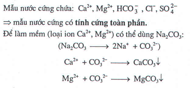 Trong một cốc nước có chứa 0,1 mol \(Na^+\); 0,02 mol \(Ca^{2+}\); 0,01 mol \(Mg^{2+}\); 0,05 mol \(HCO^-_3\); 0,02 mol \(Cl^-\). Nước trong cốc thuộc loại nào ? Nước cứng có tính tạm thời Nước cứng có tính vĩnh cửu Nước cứng có tính cứng toàn phần Nước mềm Hướng dẫn giải: Vì nước trong cốc chứa\(Ca^{2+};Mg^{2+}\Rightarrow\) nước cứng Nước cứng vừa chứa \(Cl^-\), vừa chứa \(HNO^-_3\Rightarrow\) nước cứng toàn phần