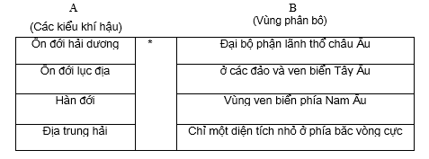 Quan sát hình 51.2 - Lược đồ khí hậu châu Âu, tr. 155 SGK, em hãy a) Hoàn thành sơ đồ : b) Nối ô chữ ở cột A với ô chữ ở cột B để nêu đúng sự phân bố của các kiểu khí hậu c) Quan sát các đường đẳng nhiệt tháng giêng, nhận xét về nhiệt độ của châu Âu vào mùa đông. ... d) Nối ô chữ ở cột A với ô chữ ở cột B để nêu đúng đặc điểm khí hậu của từng miền Ai-xơ-len và miền ven biển Tây Âu tuy nằm cùng vĩ độ nhưng chế độ nhiệt lại > khác nhau vì ... Trả lời : a) b) c) Nhận xét : Về mùa đông, nhiệt độ trung bình ở châu Âu diễn biến theo chiều tăng dần từ Bắc xuống Nam và từ Đông sang Tây. d)