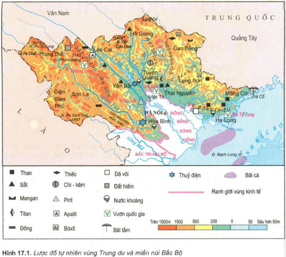 Đề bài Dựa vào hình 17.1, xác định vị trí các mỏ: than, sắt, thiếc, apatit và các dòng sông có tiềm năng phát triển thủy điện: sông Đà, sông Lô, sông Gâm, sông Chảy. Lời giải chi tiết * Các mỏ khoáng sản: - Than: Quảng Ninh, Lạng Sơn, Thái Nguyên. - Sắt: Lào Cai, Yên Bái, Thái Nguyên, Hà Giang. - Apatit: Lào Cai. * Các dòng sông: - Sông Đà: từ thượng nguồn vùng núi cao Tây Bắc chảy qua Sơn La xuống Hòa Bình. - Sông Lô, sông Chảy, sông Gâm là các nhánh sông thuộc vùng thượng nguồn của hệ thống sông Hồng (chảy qua lãnh thổ các tỉnh Lào Cai, Hà Giang, Tuyên Quang vùng Đông Bắc).